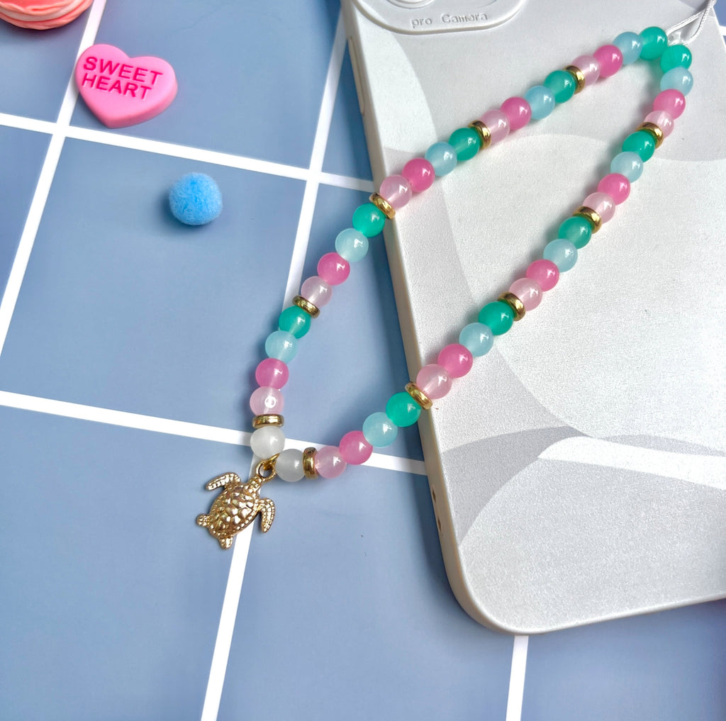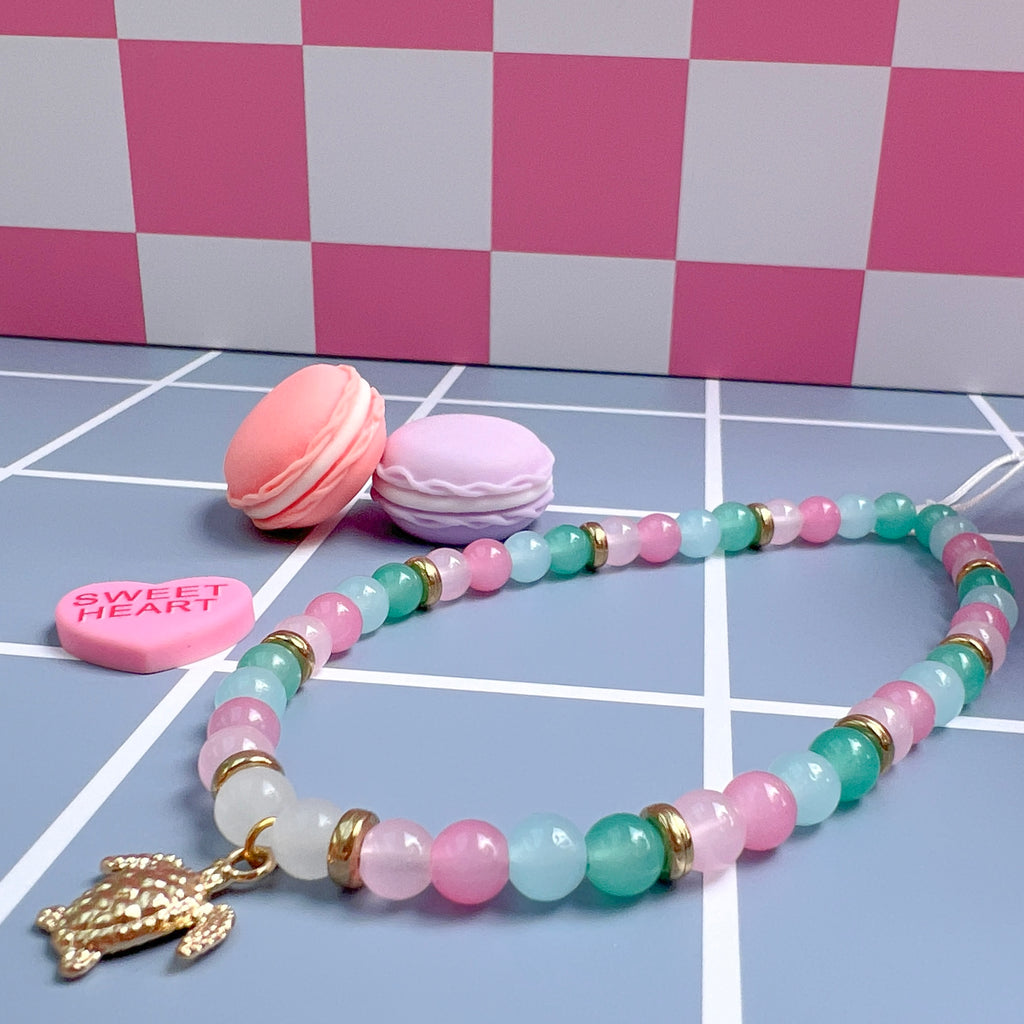 A cheerful mix of turquoise, pink, and green beads with gold accents, finished with a tiny golden turtle. Perfect for teens, tweens, and adults, it’s a fun accessory that also makes a thoughtful gift for birthdays or just because.
