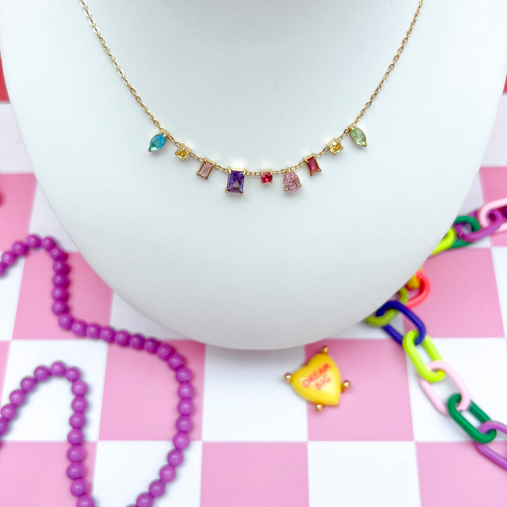 Delicate gold-plated stainless steel necklace, adorned with vibrant cubic zirconia stones in rainbow hues. Lightweight and versatile, it’s the perfect accessory to add a touch of sparkle to both everyday outfits and special occasions.
