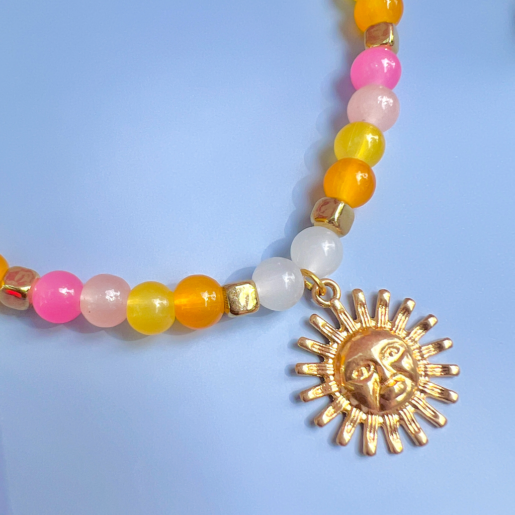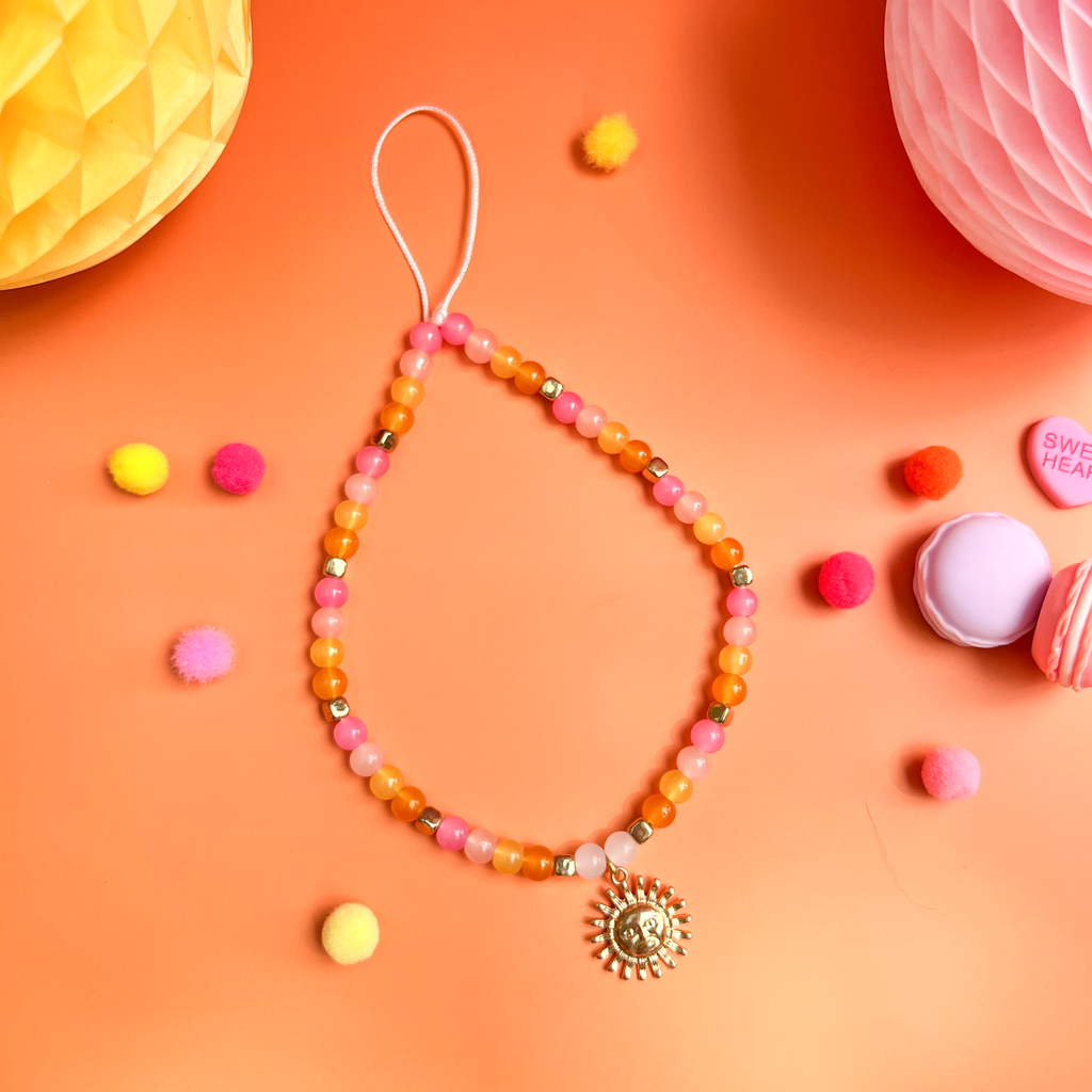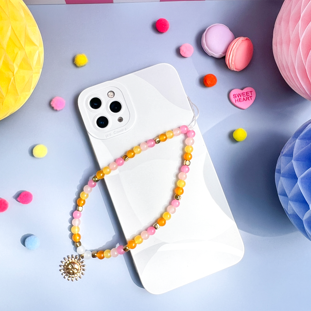 Warm orange and pink beads with a radiant golden sun charm bring joy to any phone. A bright pick for anyone — from young trendsetters to adults — and a sunshine-filled gift idea.