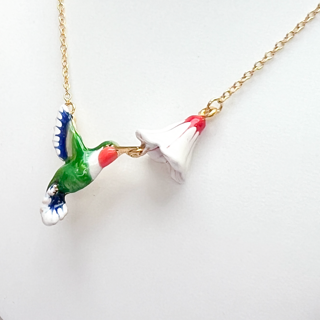 Celebrate nature’s beauty with this charming hummingbird necklace, featuring a vibrant enamel bird sipping from a delicate flower. The gold-toned chain adds elegance, making it perfect for everyday wear or a thoughtful gift.